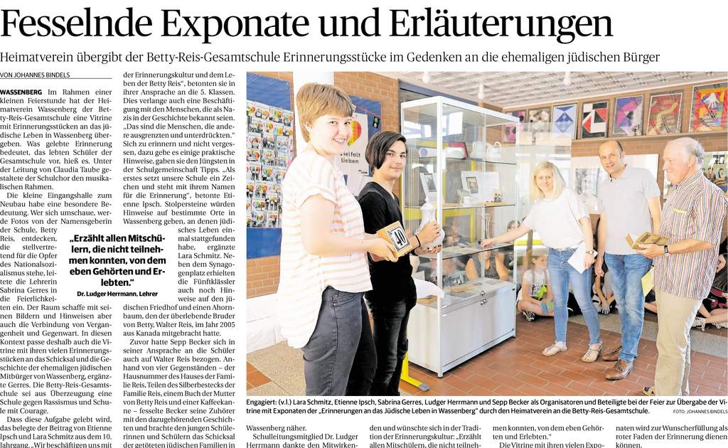Nicht zuletzt aufgrund unseres Schulnamens bildet die Beschäftigung mit dem „Jüdischen Leben in Wassenberg“ an verschiedenen Stellen einen Schwerpunkt des Unterrichts. Hierbei können wir in Zukunft auf eine besondere Ausstellungsvitrine zurückgreifen, die der Arbeitskreis „Jüdisches Leben“, in dem wir mit dem Heimatverein der Stadt Wassenberg kooperieren. gestaltet hat. Zusammen mit dem Porträt von Betty Reis, das ihr Schicksal zusammenfassende Gedicht von Professor Heinrichs und dem Bild ihres Bruders Walter bildet die Vitrine eine kleine dauerhafte Ausstellung.