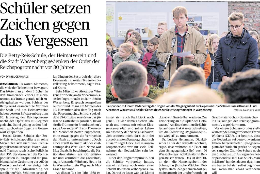 Über 200 Menschen, darunter Vertreter/-innen aller Jahrgänge der Betty-Reis-Gesamtschule, versammelten sich am 09. November 2018 am Synagogenplatz, um gemeinsam das Gedenken an die Reichspogromnacht vor 80 Jahren zu begehen. Die Gedenkfeier war in Zusammenarbeit von Stadt, Heimatverein und Schule vorbereitet worden.