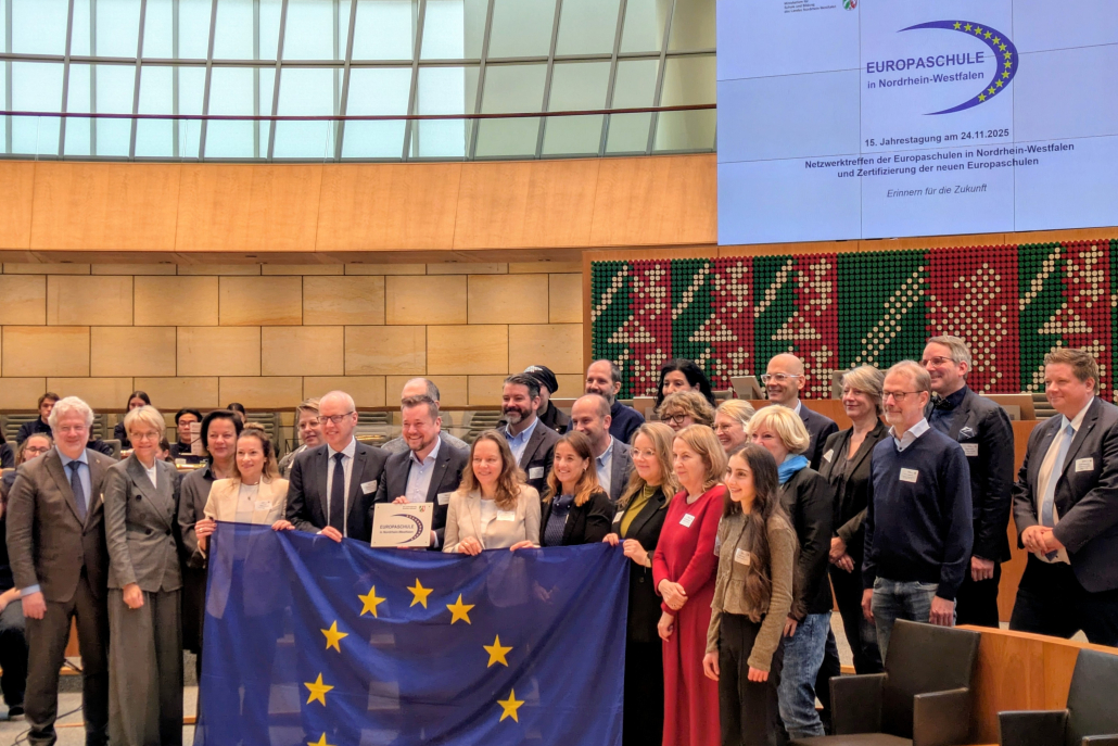 Stellvertretend für die Schule war Schulleiter Dr. Ludger Herrmann am 24. November 2025 zum Netzwerktreffen der Europaschulen nach Düsseldorf gereist. Dort freute er sich mit unserer Koordinatorin „Europaschule“ Alexandra Kolb und Fremdsprachenlehrerin Julia Sieben über die Auszeichnung und Beglückwünschung durch die Schulministerin.